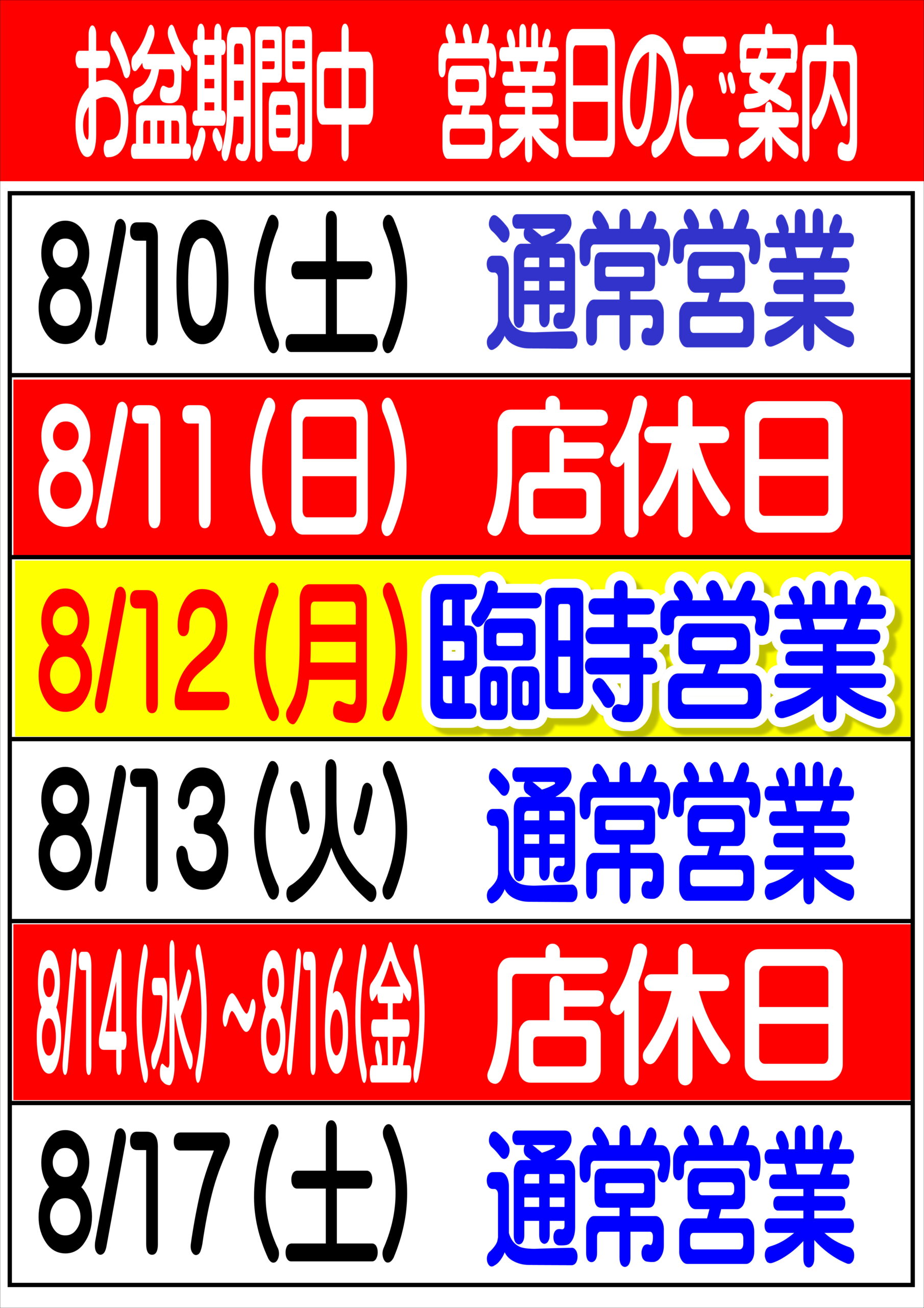 お盆期間中の営業日のお知らせ