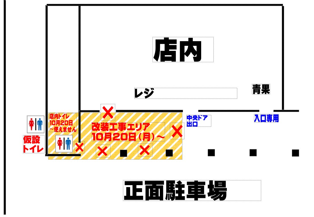 店内トイレ 10月20日(月)11月19日(水) 店内奥のトイレは使用できません。西側(店舗外)に設置の仮設トイレをご利用ください。
